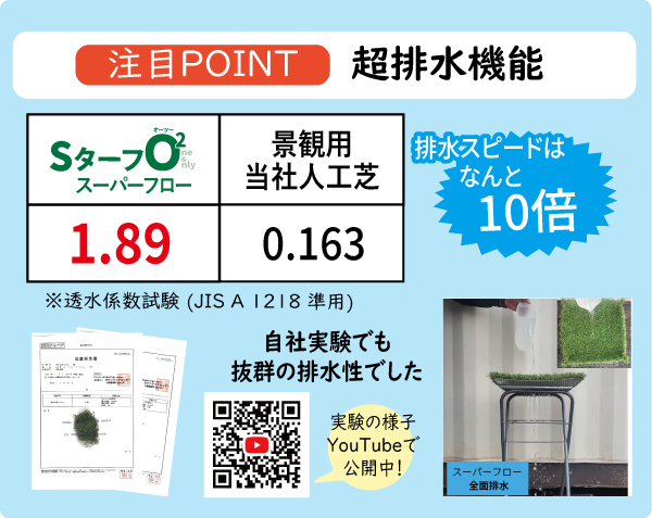 SターフO²の機能(静電気抑制・抗菌防臭防カビなどの)はそのままに、【超排水】と【遮光性】の2つの機能を両立したスーパーフローを裏面に採用し、通常の景観用人工芝と比べて10倍の排水スピードを実現!