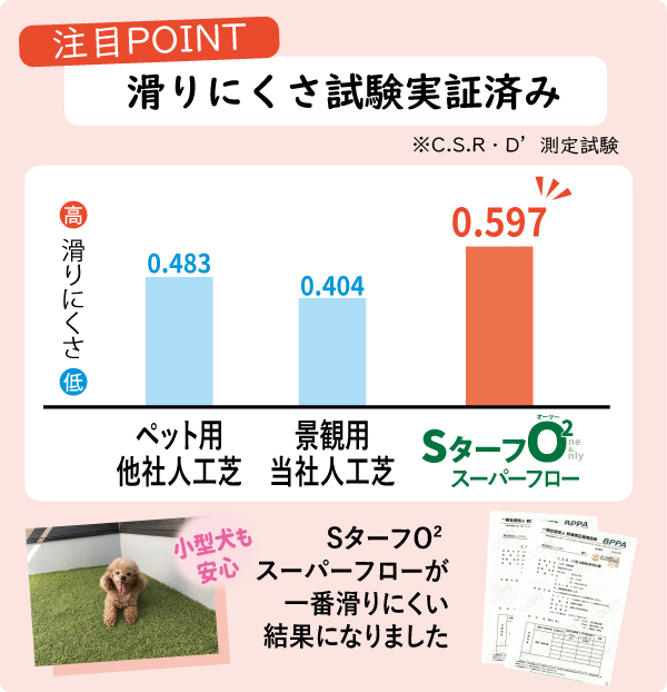 加えて、滑りにくさ試験(C.S.R・D’測定試験)の試験結果においても滑りにくさが実証されています。